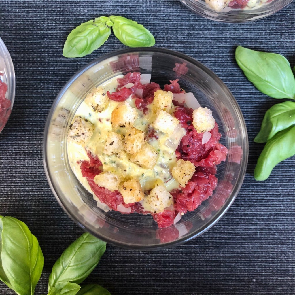 - Verdeel het vlees over 4 glazen. Giet hier vervolgens de basilicumsaus overheen en top de tartaatjes af met de croutons.