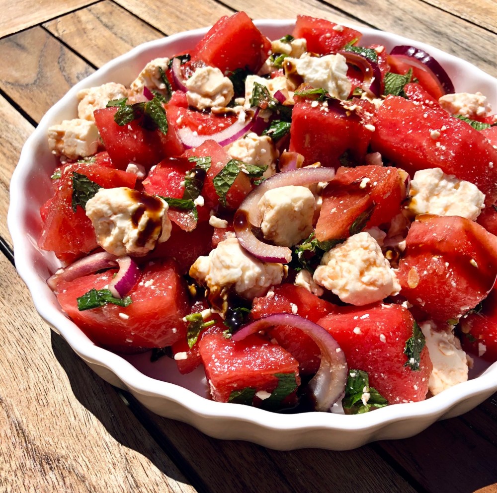 - Meng de watermeloen, feta, ui en munt met de azijn.