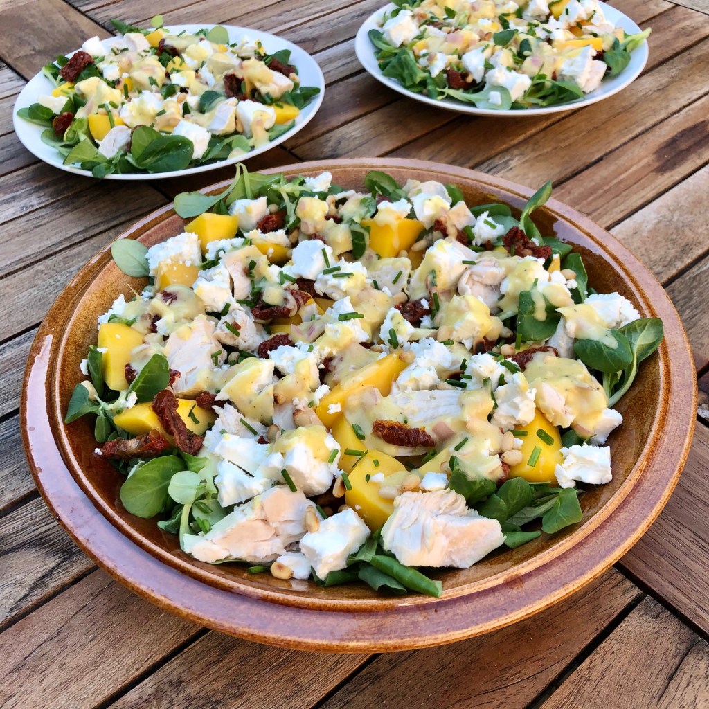 - Doe in een grote wijde schaal eerste de veldsla, daarna de kip, tomaten, mango en feta. Verdeel de dressing hier overheen en daarna de pijnboompitten en bieslook.