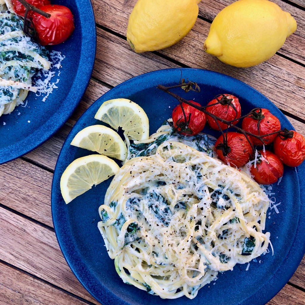 - Meng de spinazie door de ricottasaus en voeg een beetje kookwater toe zodat het een romige structuur krijgt. Vermeng dit met de linguine en dien op. Serveer eventueel met extra Parmezaanse kaas en citroenschijfjes ter garnering.
