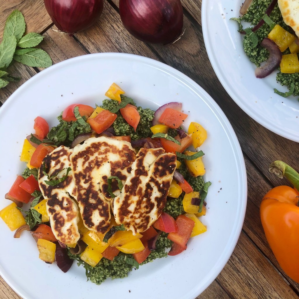 - Breng de couscous op smaak met peper en eventueel zout. Serveer met de paprika, rode ui, halloumi en muntreepjes.