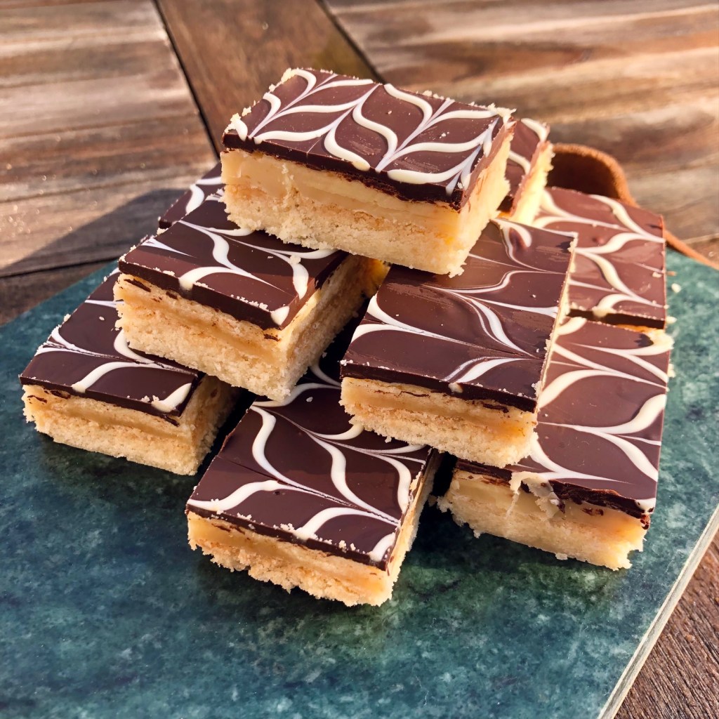 - Verdeel de karamel over de shortbread. Zet de bakvorm vervolgens in de koelkast (of vriezer als je daar ruimte voor hebt) om af te koelen.