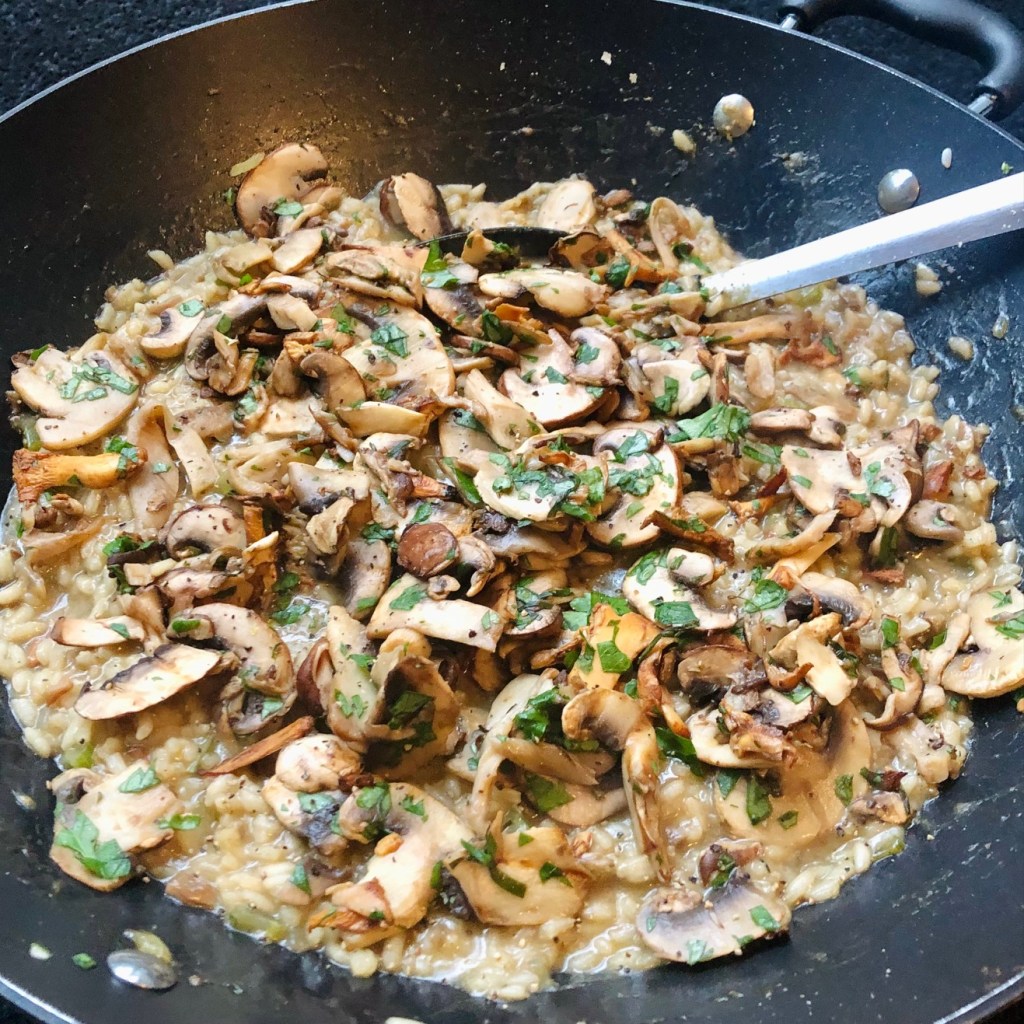 - Serveer de risotto met de gemarineerde paddenstoelen er bovenop. Eet smakelijk!