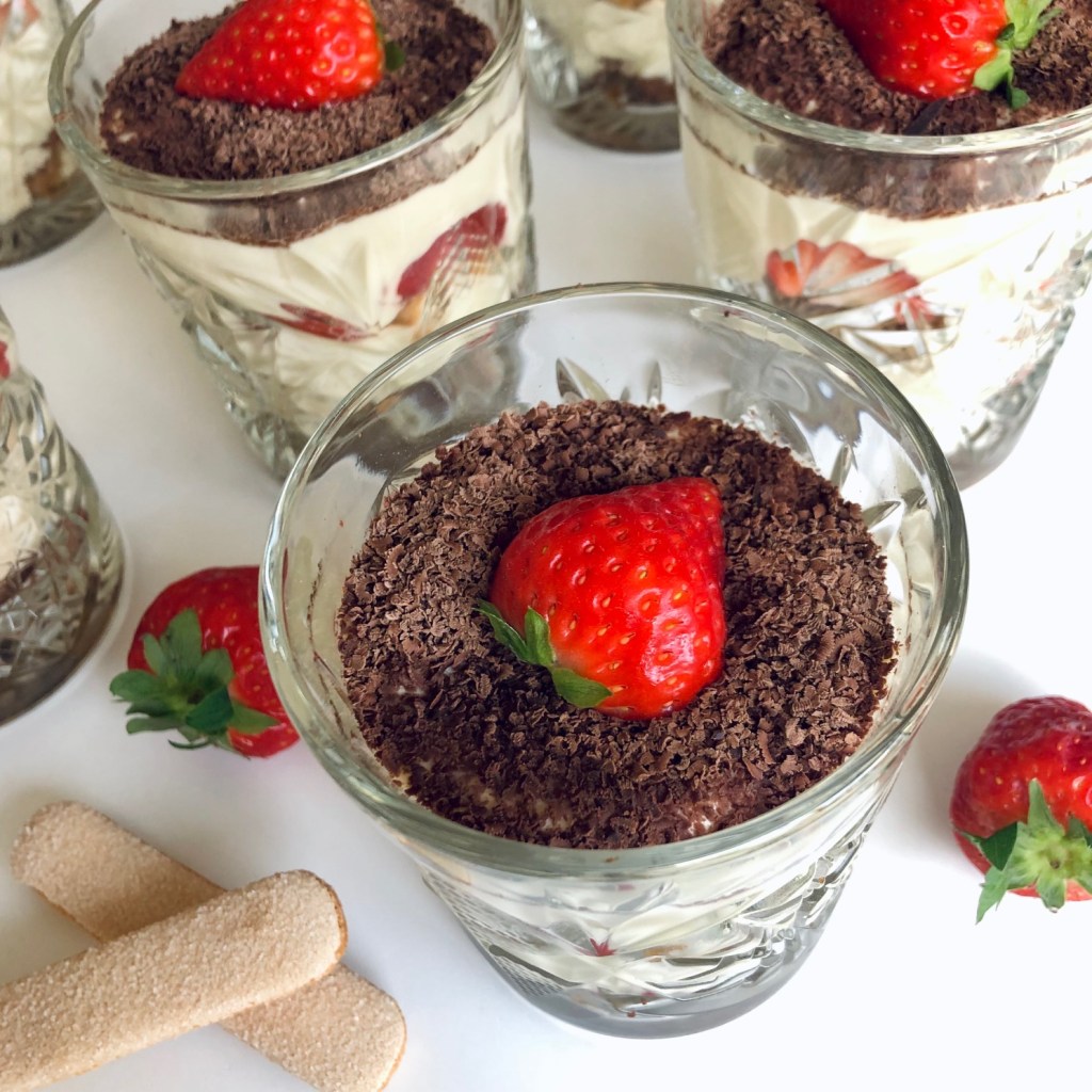 - Begin met een laag van lange vingers gedoopt in koffie. Verdeel hier vervolgens ongeveer de helft van de aardbeien overheen. Bedek dit met de helft van het roomkaas-pudding mengsel en daarna de helft van de geraspte chocolade. Herhaal deze stappen. Eindig met een halve aardbei ter garnering.