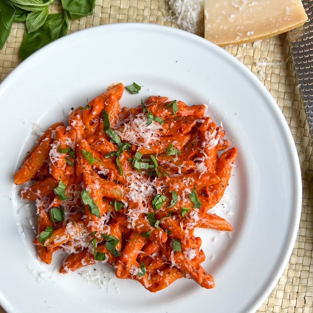 - Meng de pasta door de saus. Garneer met wat fijngehakte basilicumblaadjes en versgemalen zwarte peper. Eet smakelijk!