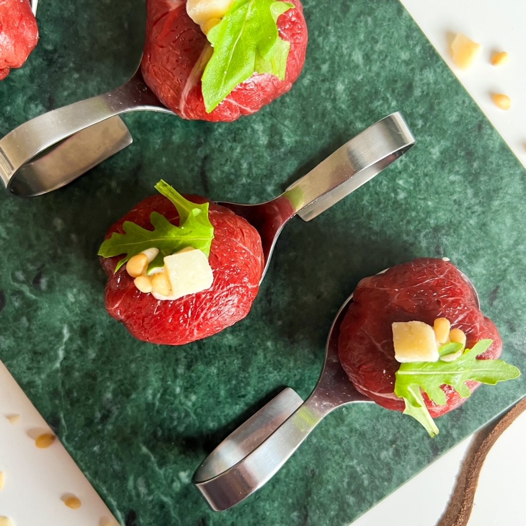 - Pel voorzichtig de plakjes carpaccio een beetje van elkaar los. Gebruik een kwart van alle carpaccio per bonbon.