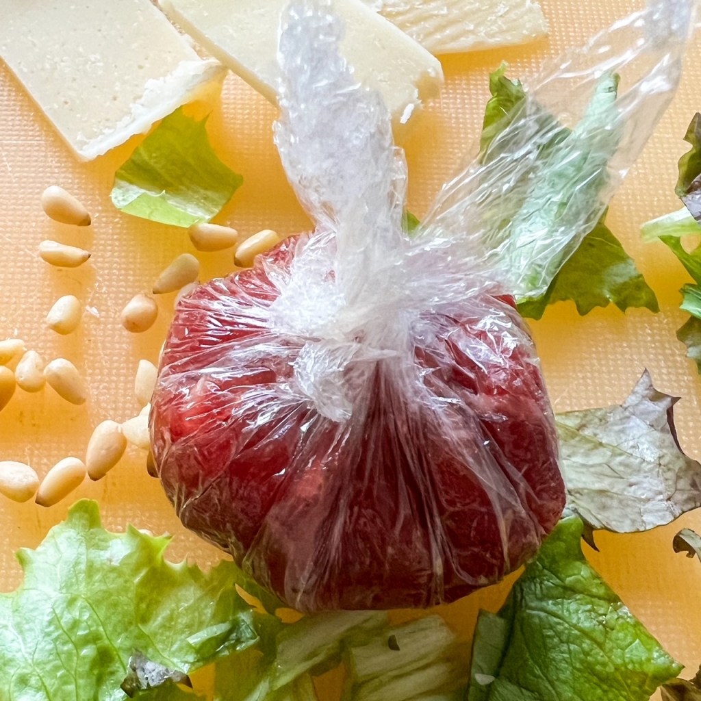 - Vouw de randjes van de carpaccio een beetje naar binnen en gebruik daarna het folie om een bonbon te creëren: breng alle hoeken naar elkaar toe en draai een toffee zoals op het plaatje. Maak het folie vervolgens weer los.