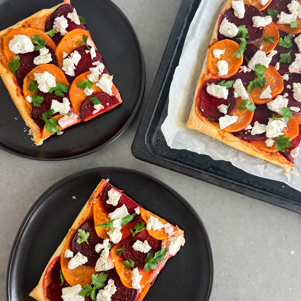 - Verdeel de plakken aardappel en biet dakpansgewijs over de taart.
